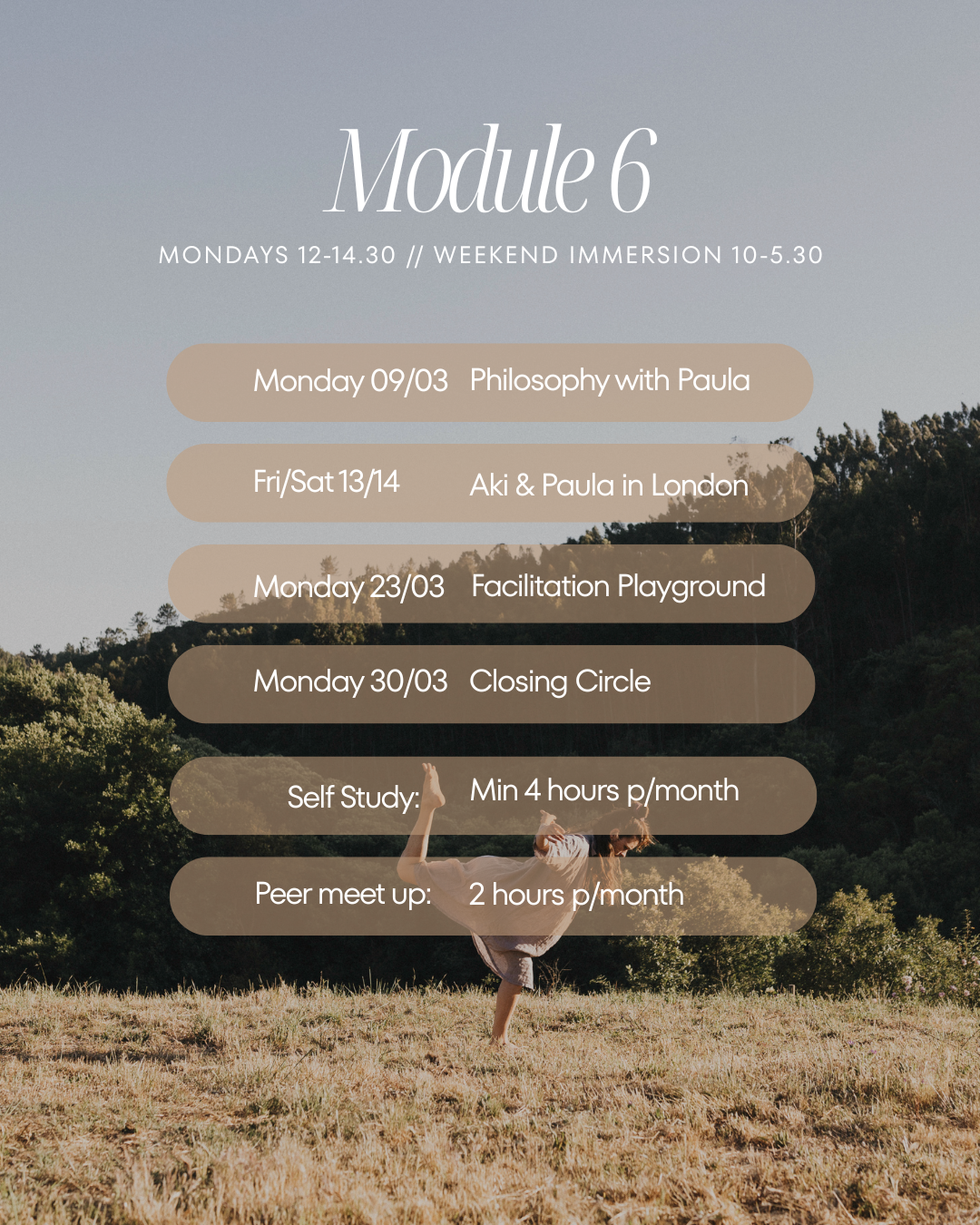 Monthly peer meetings are part of this programme as a way for you to parse apart some of the material we are studying to share perspectives, discuss ideas, practice facilitating, explore challenges and build your peer community. You will gather in pairs or 3’s for 2 hours a month. This could be a weekly 30 minute check in, or a 2 hour deep dive once a month - to be arranged with you and your group. Peer groups will be assigned when we begin the course.